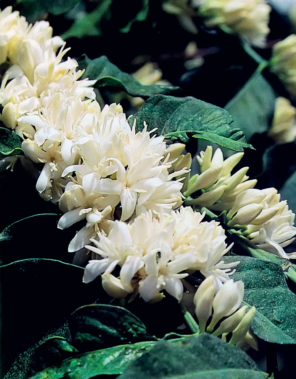 Two or three times a year, after heavy rains, the coffee tree bears wonderful, pure white flowers. The blossom’s heady fragrance has been likened to that of jasmine or the orange blossom. A tree that has recently matured will bear 20–30,000 flowers a year.